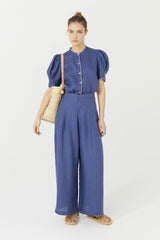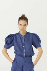 Flattering and flirty, this 100% natural linen shirt with embroidered details features puffed short sleeves, a minimalist mao neck and shell buttons on the front.